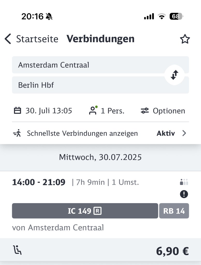 Alle opties zoals je ze graag wil hebben? Druk dan simpel op zoeken en DB stelt zelf een reis voor. Als voorbeeld heb ik Amsterdam – Berlijn genomen. Ik zoek alleen een zitplaatsreservering omdat ik zelf al een ticket voor de eerste klasse bezit, en voila, DB stelt een reis voor. Normaliter zou IC149 direct naar Hbf rijden, maar door werkzaamheden rijd die deze periode van Berlin Spandau naar Gesundbrunnen, dus op Spandau even overstappen op een stoptreintje.